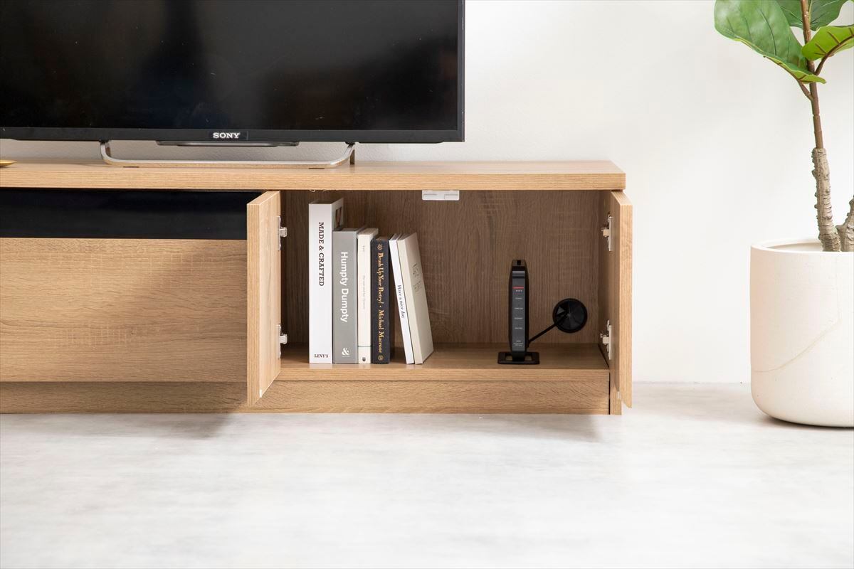 洗練されたデザインは、リビングや寝室、さらにはオフィスなど様々なシーンにフィットします。ブラックパネルのシックな外観は、インテリアにアクセントを加えながらも落ち着いた雰囲気を保ちます。大きなテレビを置くための広々とした天板と、収納スペースを兼ね備えた引き出しは、機能性も考慮されています。